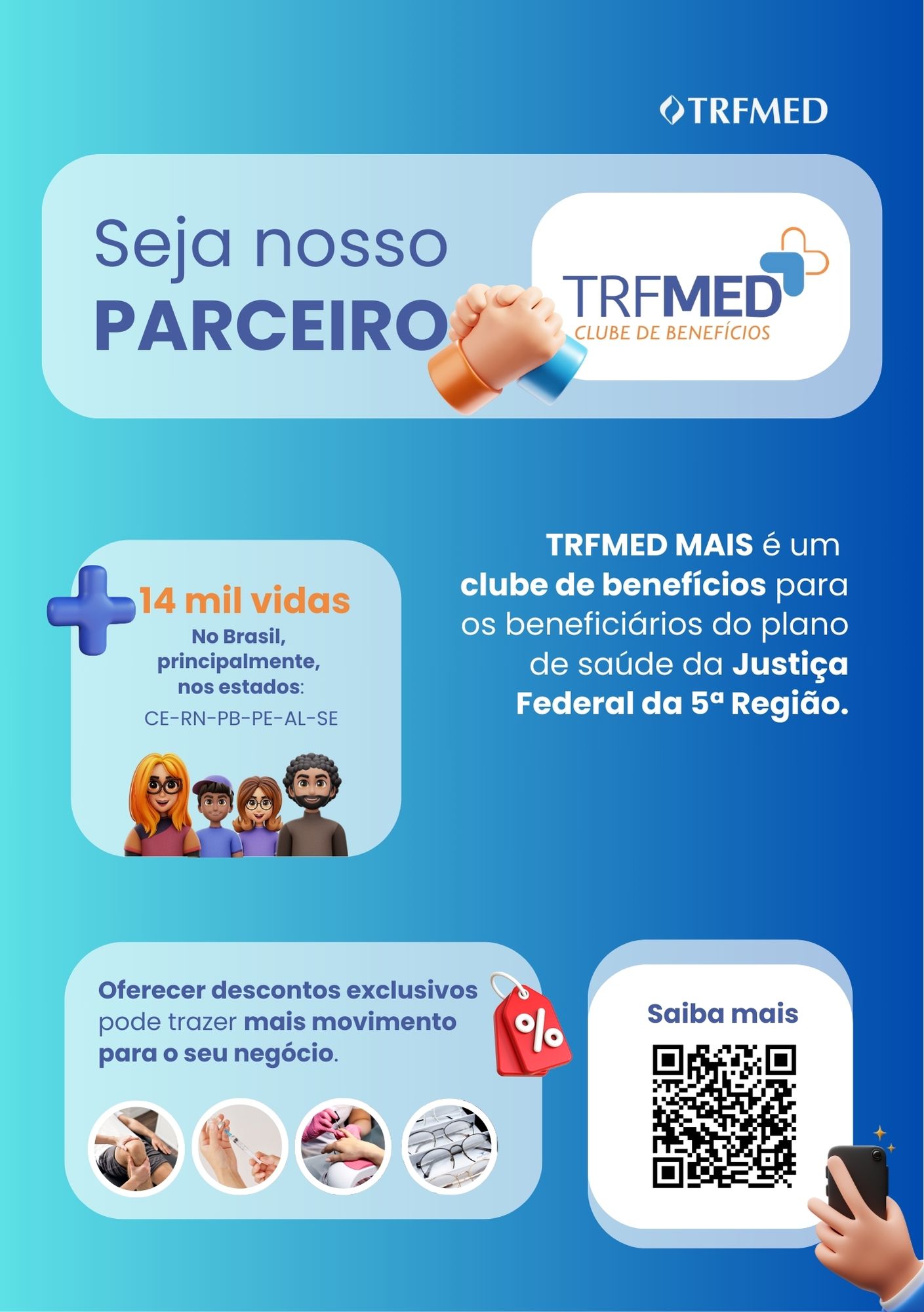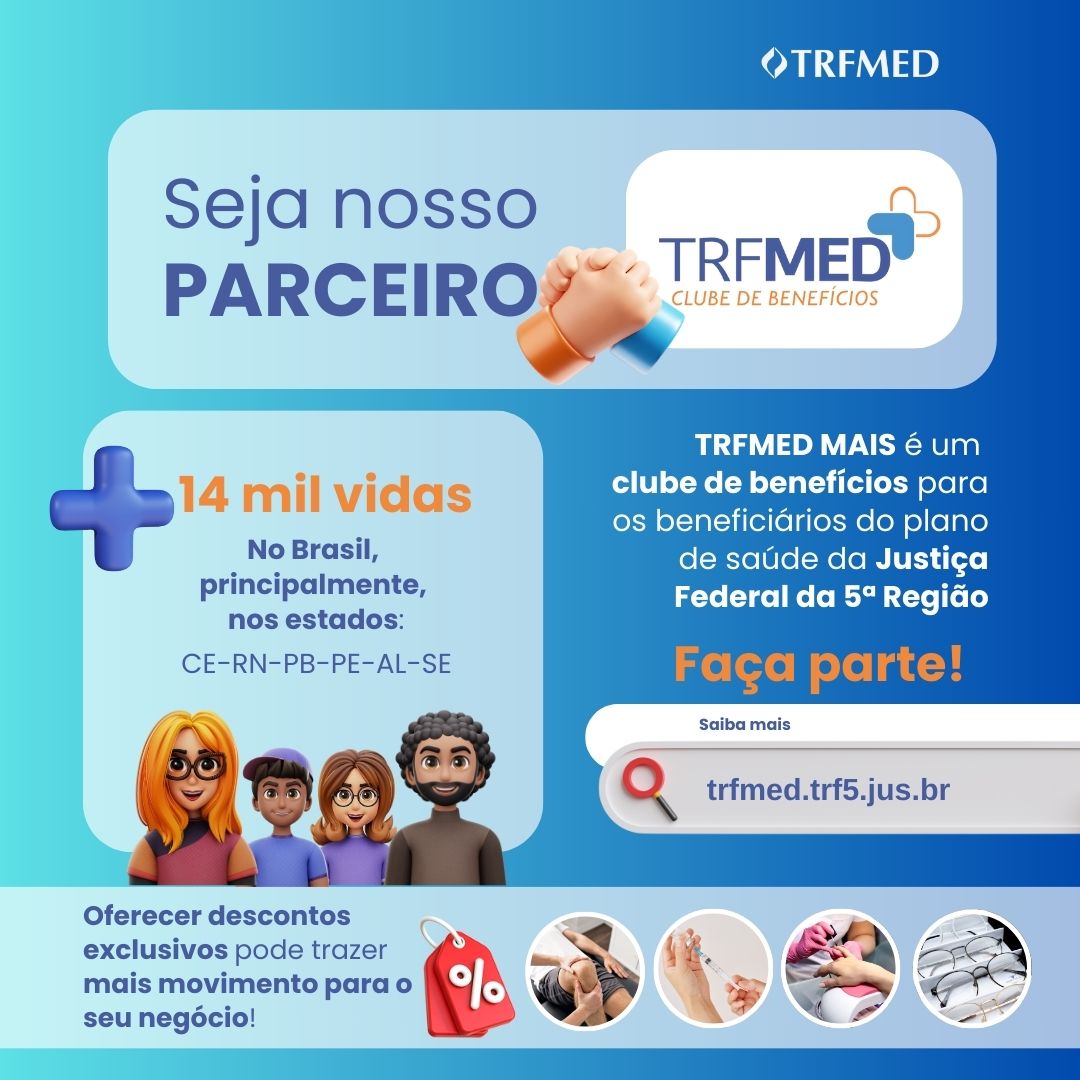 O TRFMED MAIS, clube de benefícios da Justiça Federal da 5ª Região, está buscando novos parceiros. Temos uma base qualificada de beneficiários em AL, CE, PB, PE, RN e SE prontos para conhecer o seu serviço.
